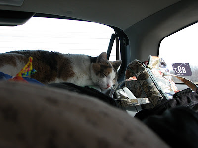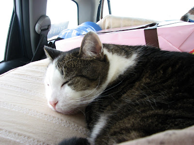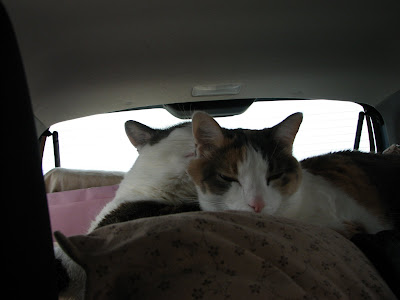 The cats pretty much slept the whole time- except for a stretch of time where they snuggled and Ender gave Val a little bath to comfort her. They were very cute and so good during the drive- until the end when they started getting restless and Ender insisted on driving!